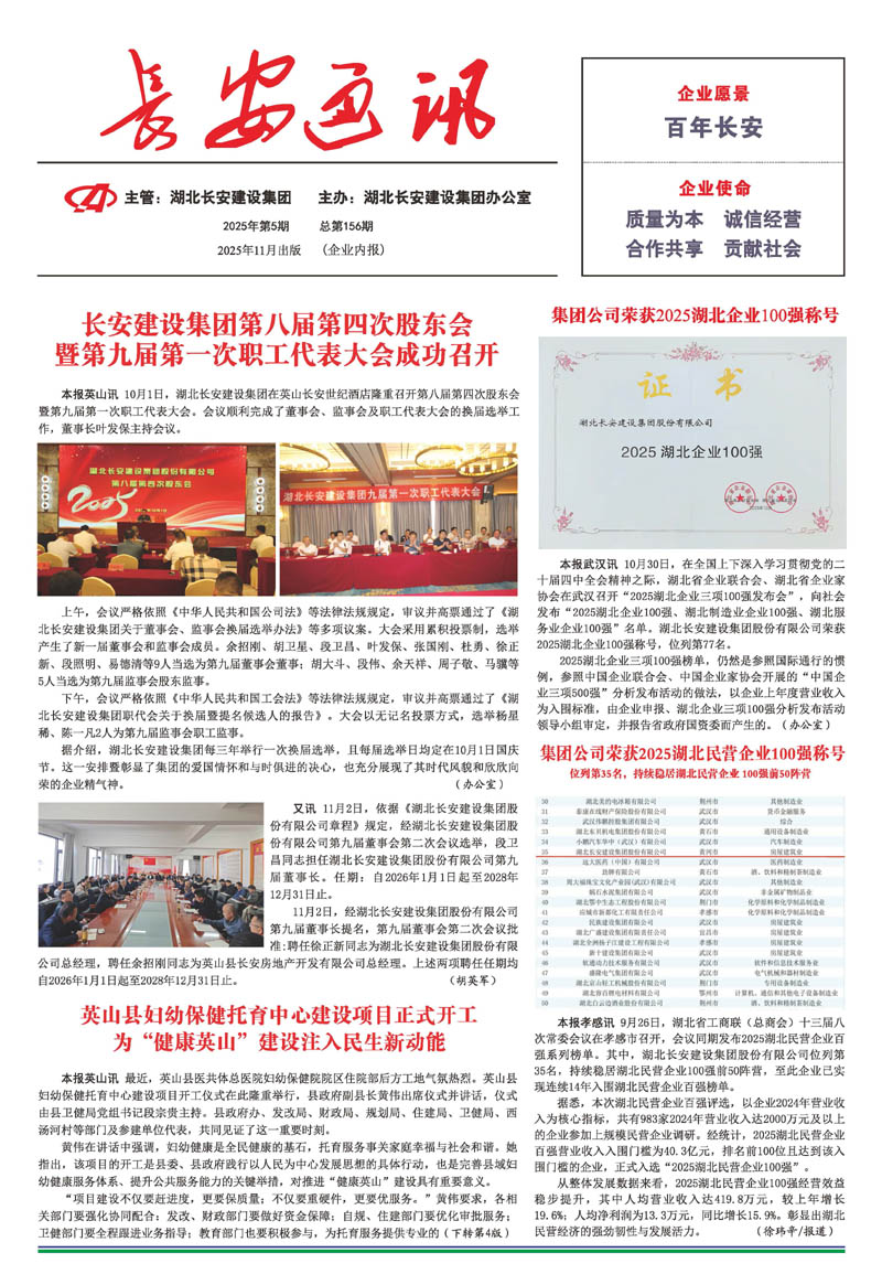 • 2025-09-27 湖北長(zhǎng)安建設(shè)集團(tuán)股份有限公司 榮獲2025湖北民營(yíng)企業(yè)100強(qiáng)稱號(hào),位列第35名